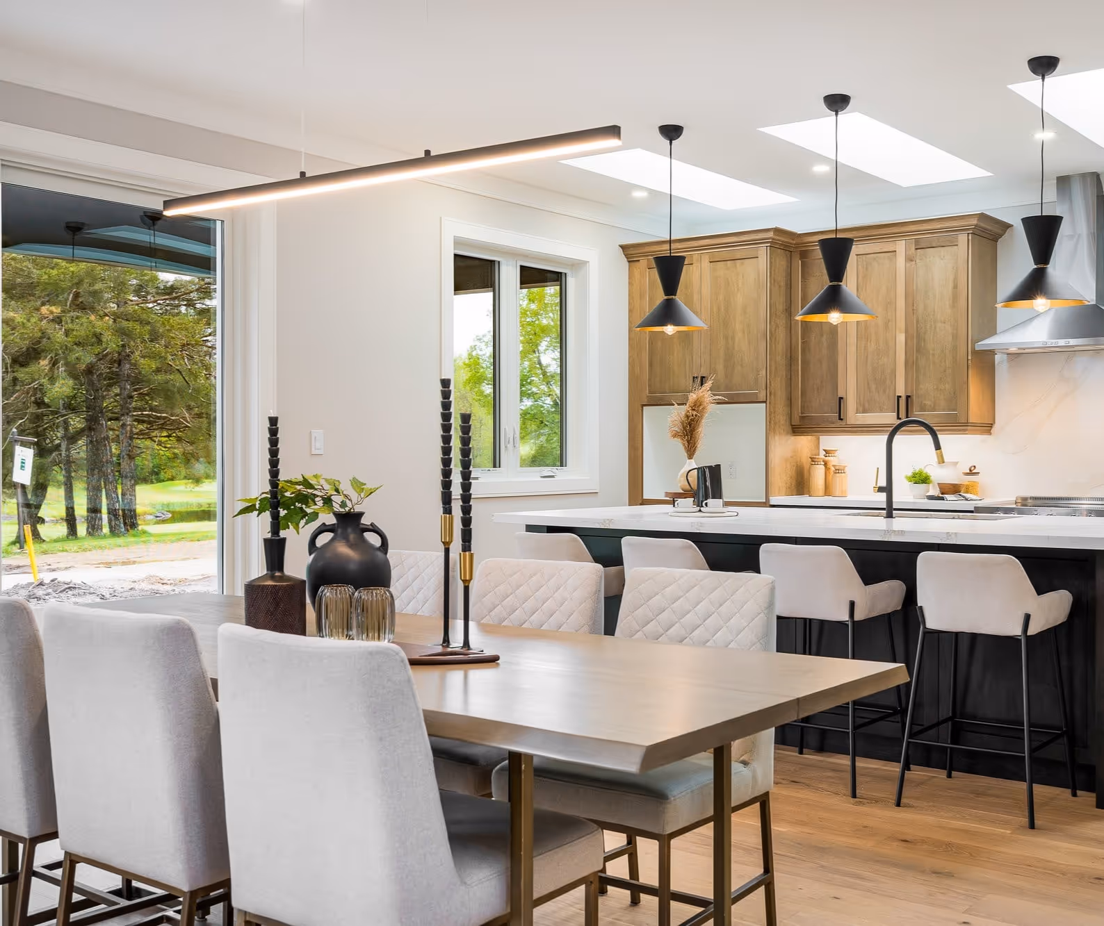 Skylights wash the two-tone kitchen in soft daylight, highlighting the expansive island and white-oak floors. Sleek fixtures and Farrow & Ball hues elevate everyday cooking, while the adjacent dining area looks out to mature trees and the covered retreat.