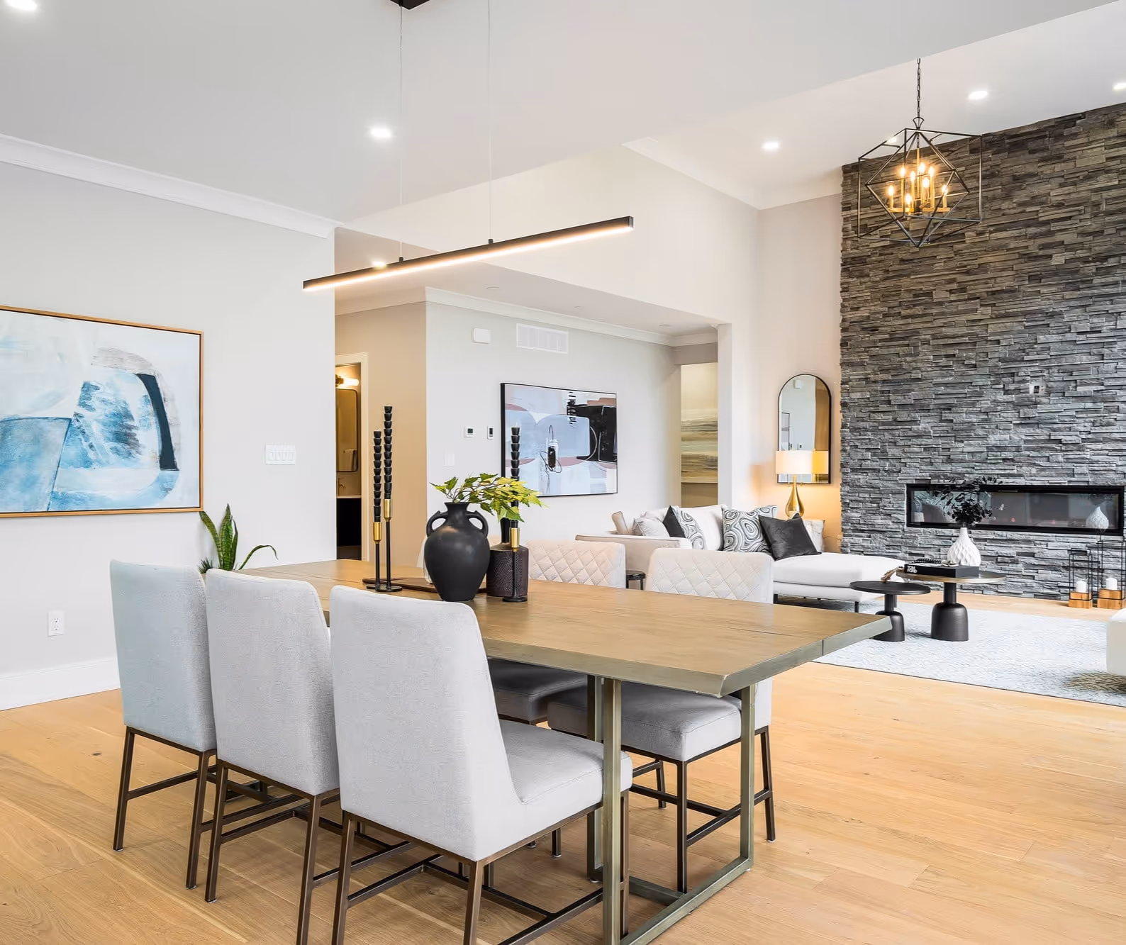 Drama meets comfort in the great room anchored by a 15-foot stone fireplace wall. Airy volume, modern lighting, and expansive windows frame golf-course greens, while sightlines into the kitchen and dining keep conversations flowing from fire to table.