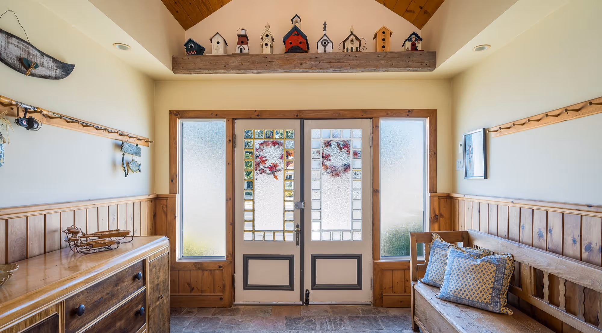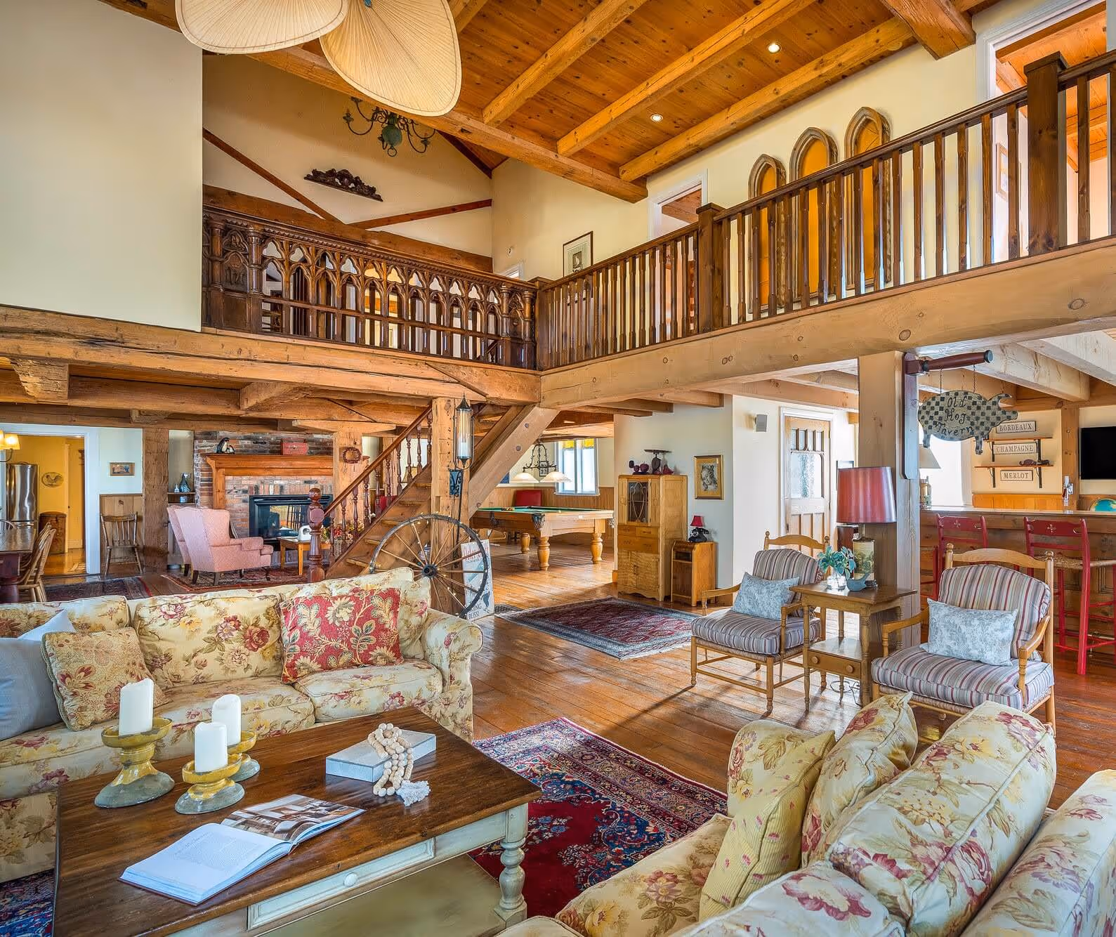 Post-and-beam cathedral ceilings frame a living space that feels both majestic and deeply personal. The glow of stained glass and the crackle of a wood-burning fireplace create an atmosphere of restoration—a space where family and friends linger long after dinner is done.