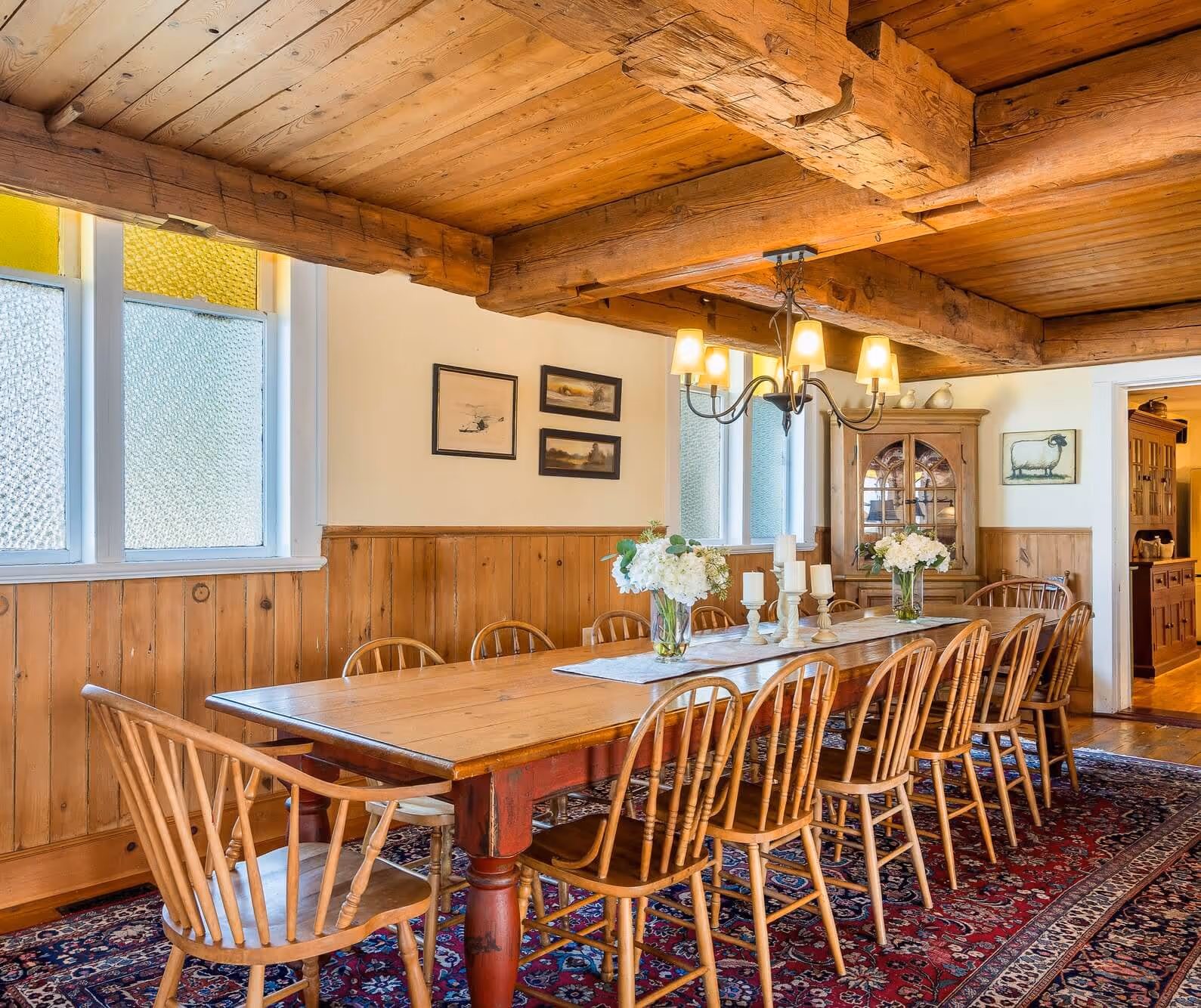 This is where meals turn into memories. A long farmhouse dining table seats fourteen without a single folding chair, while the open-concept kitchen blends heritage charm with modern functionality. From breakfast to big celebrations, everything flows effortlessly here.