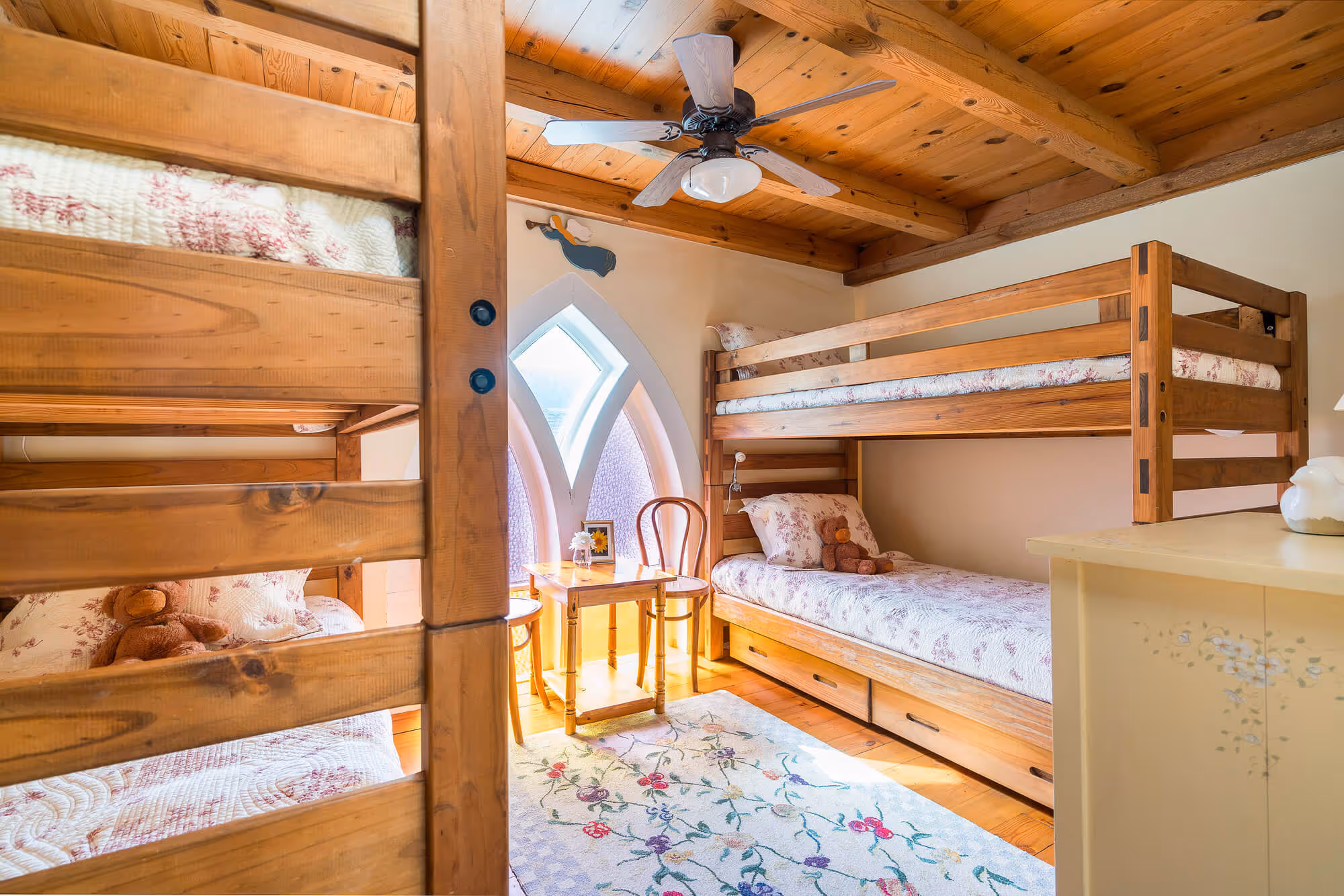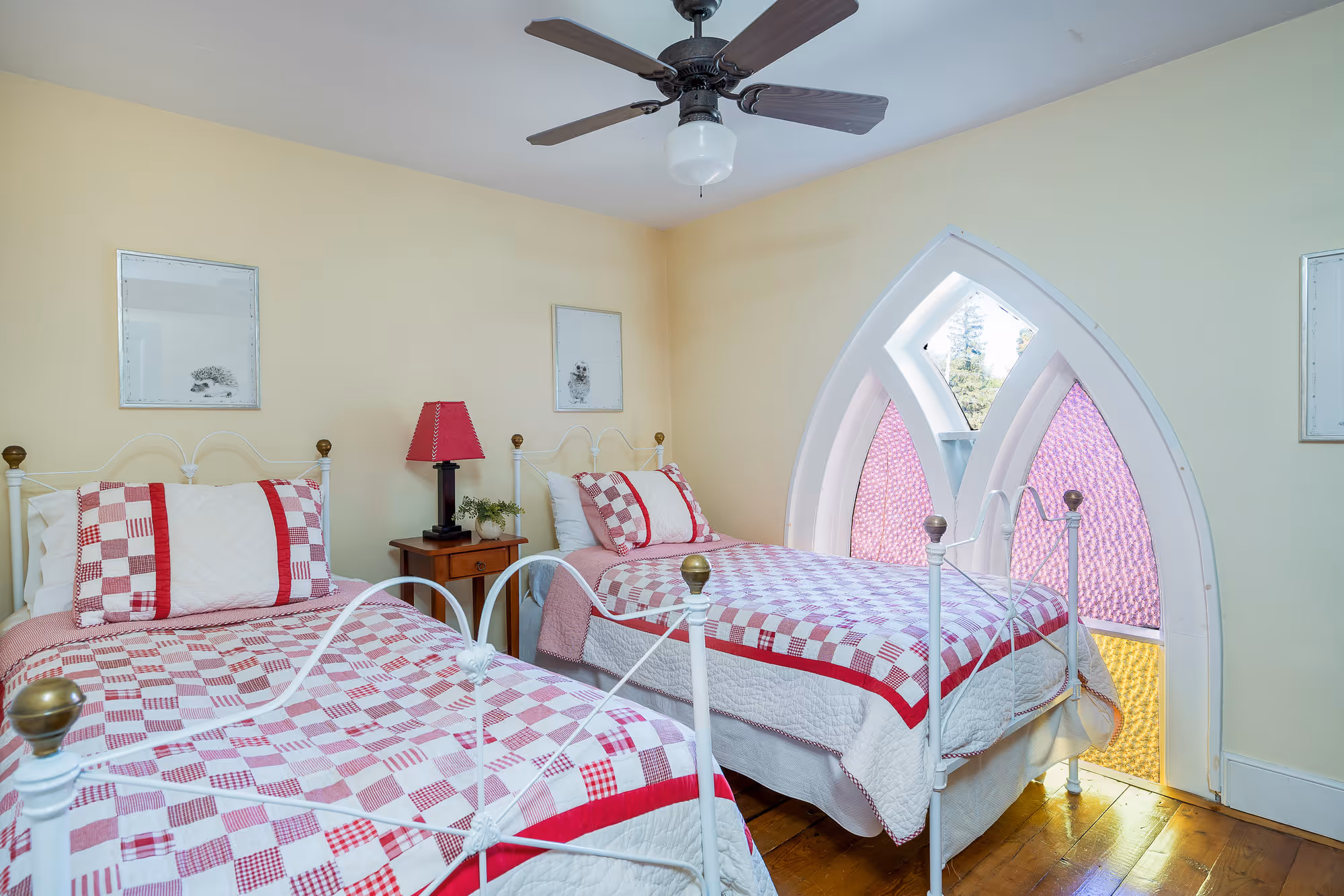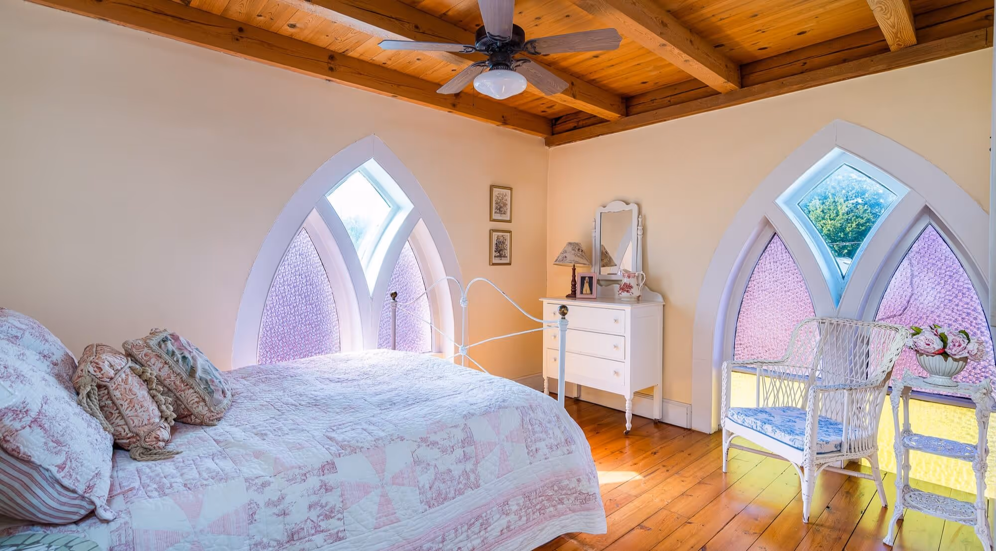 Upstairs, additional four bedrooms offer playful charm and restorative calm in equal measure. Each space is bright, airy, and framed by stained glass windows that shift with the sun. Whether hosting guests or housing generations, every room feels considered and full of personality.