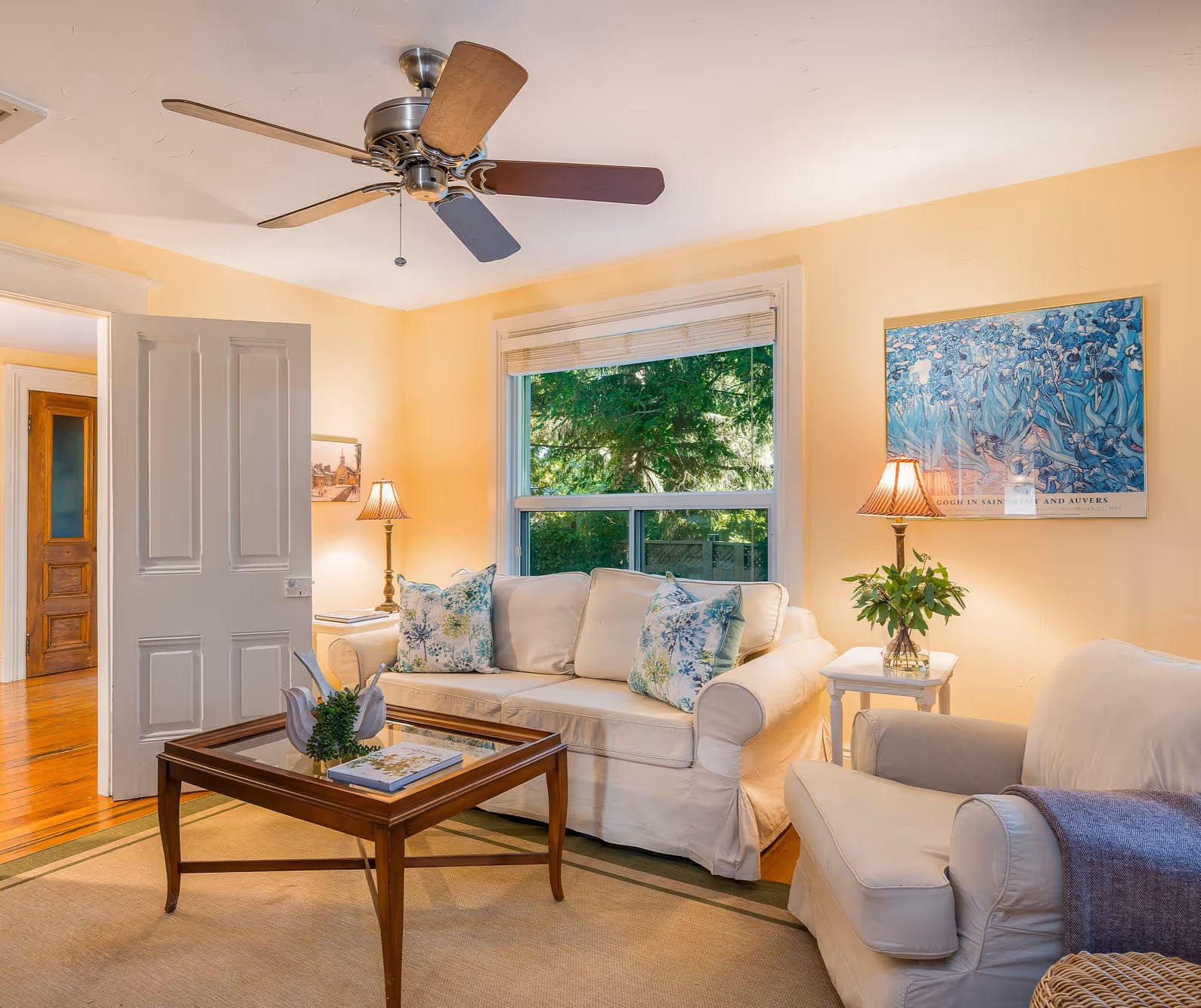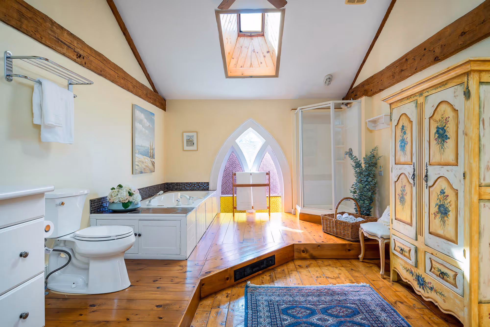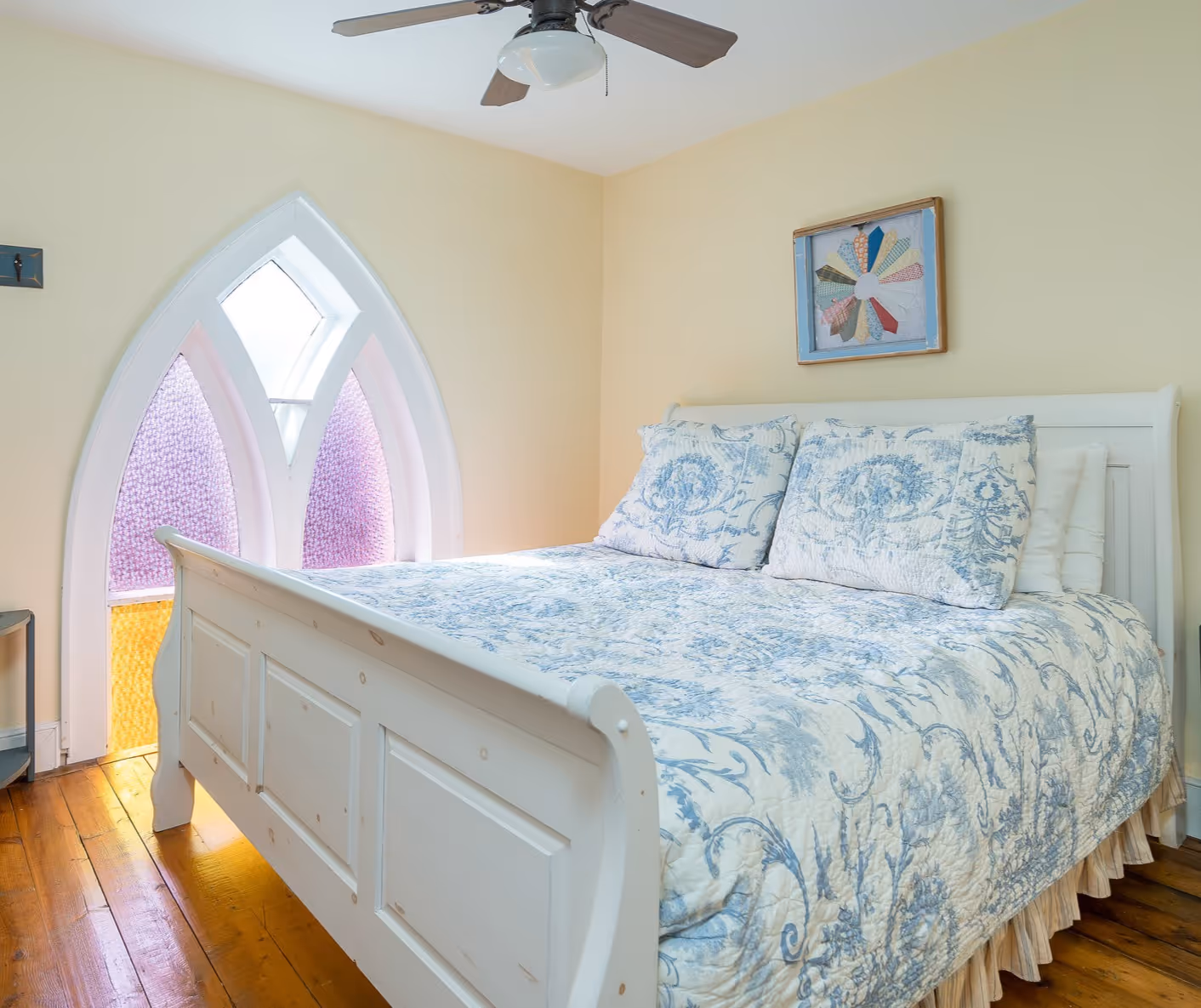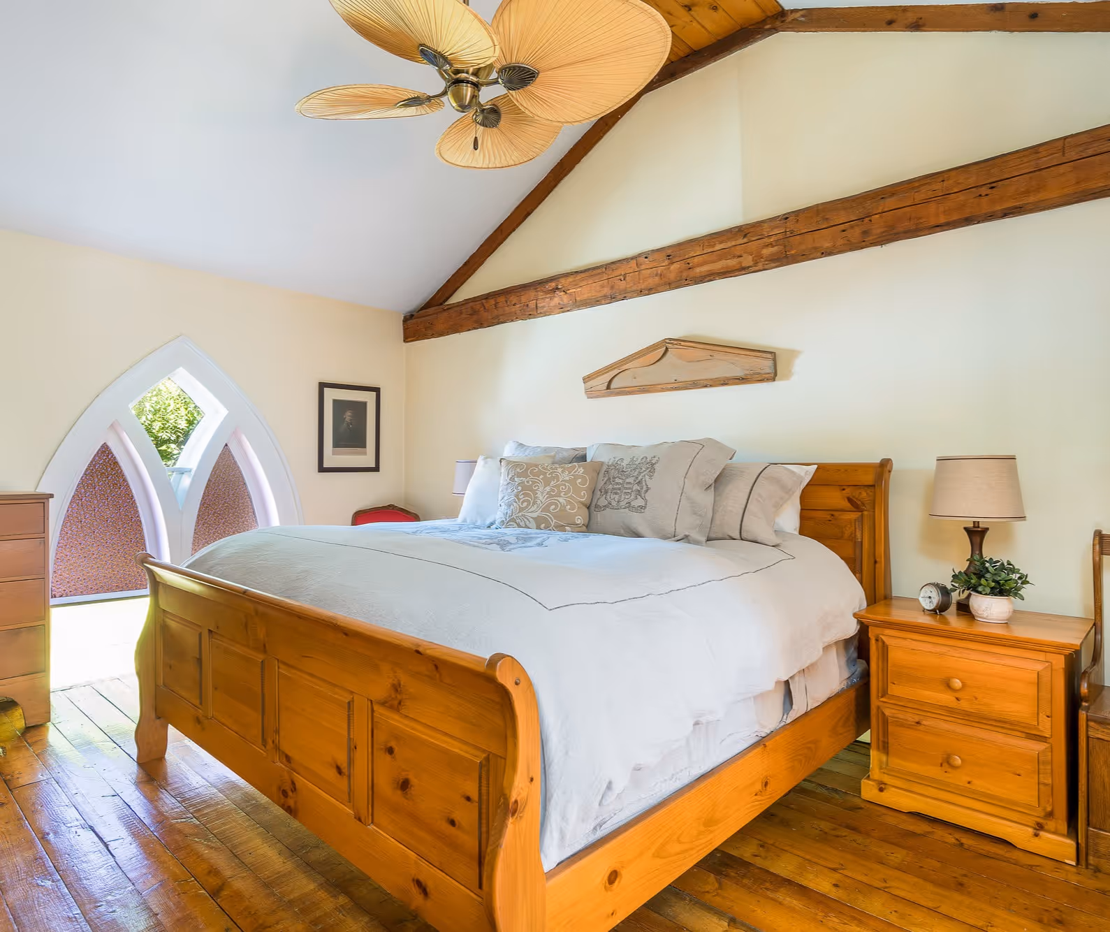 Upstairs, additional four bedrooms offer playful charm and restorative calm in equal measure. Each space is bright, airy, and framed by stained glass windows that shift with the sun. Whether hosting guests or housing generations, every room feels considered and full of personality.