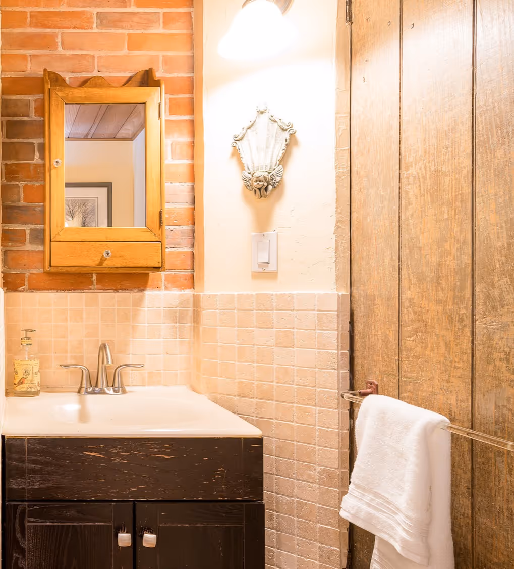 A moment of pause as you step inside: soft wood, crisp brick, and filtered light from stained glass set a tranquil rhythm. This entryway isn’t just a threshold—it’s a signal that you’ve arrived somewhere meant for connection, calm, and long conversations that begin with taking your coat off.