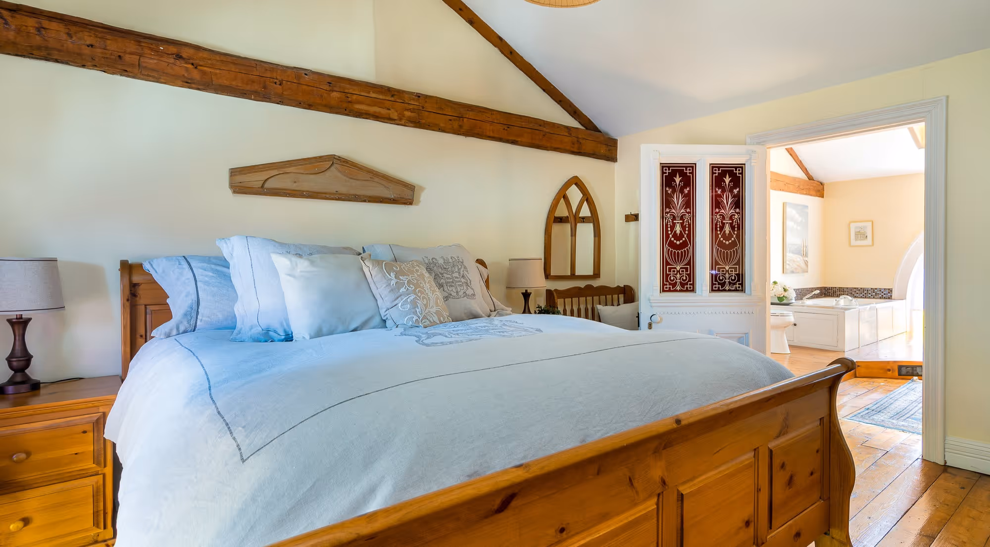 Tucked beneath vaulted beams, the primary suite feels serene and elevated. Morning light spills across warm wood floors, while the adjoining four-piece bath—with its soaking tub and arched window—feels made for unhurried mornings and restorative evenings.