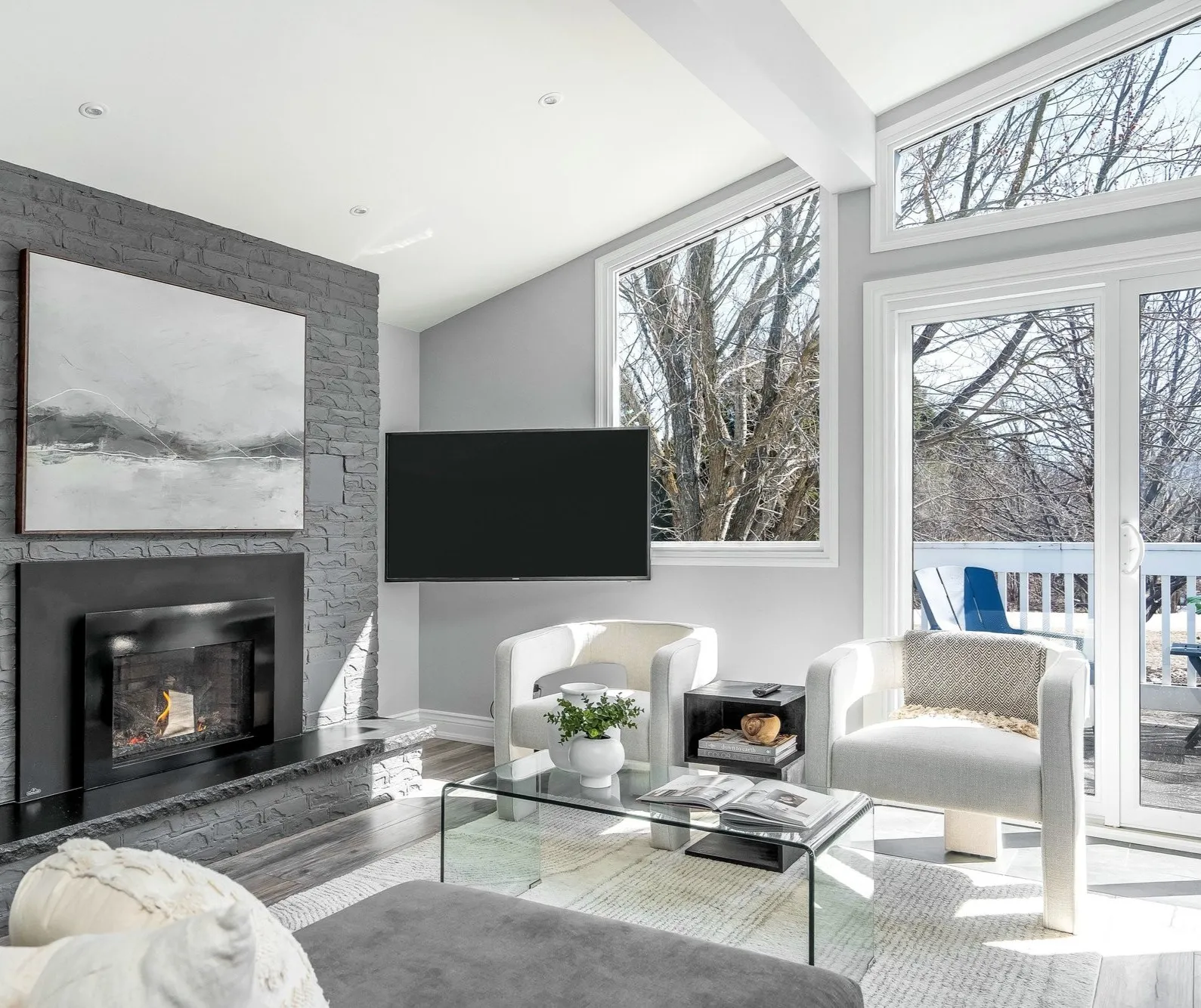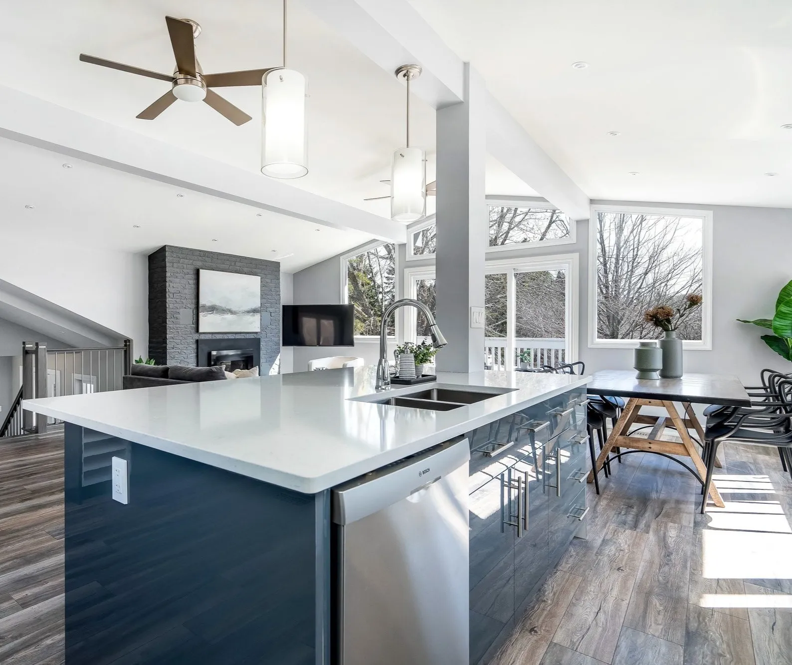 Large windows and an open-concept layout define the main living level, filling the space with natural light throughout the day. The fireplace adds a strong gathering point, while the deck just off the living area becomes a natural place for meals, coffee, and relaxed evenings.